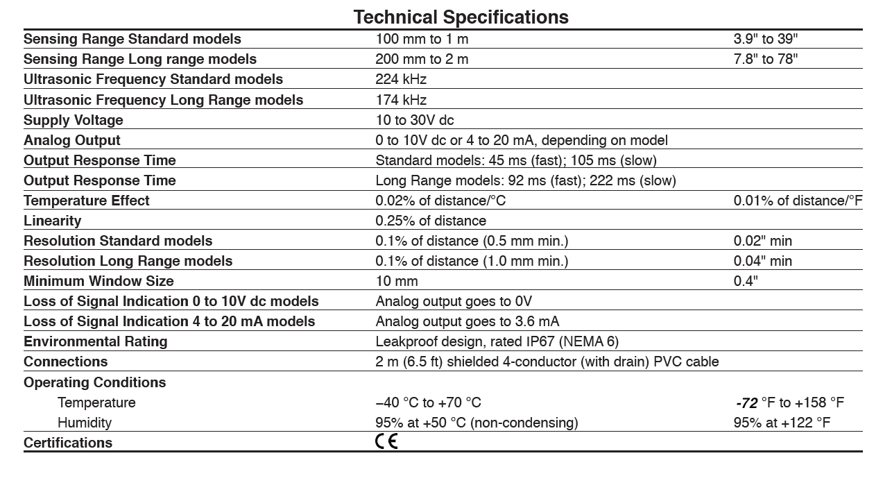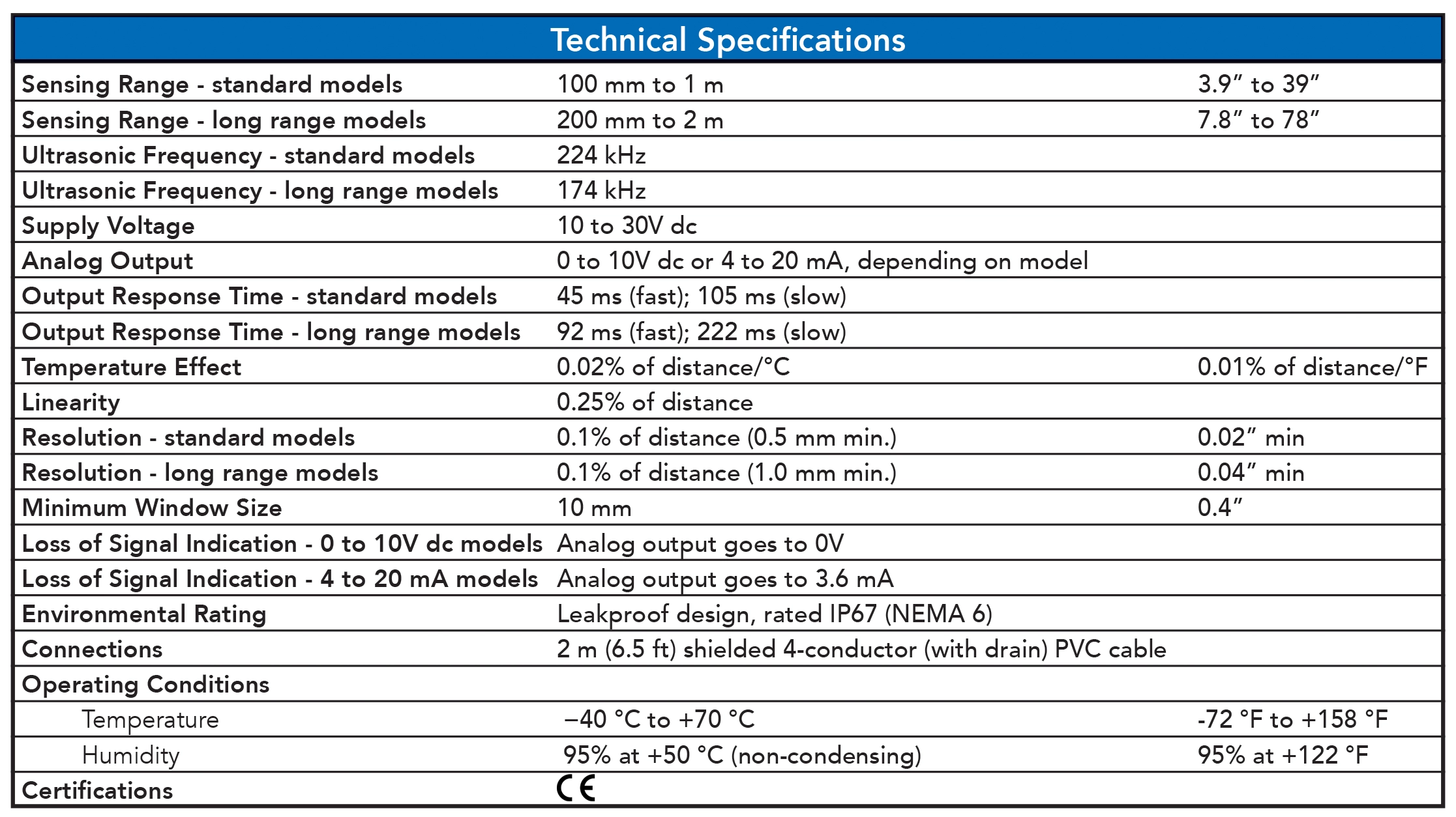 The Double E Group Ultrasonic Diameter Sensor uses sound waves to measure distance from the sensor to the roll of material. Distance is calculated by measuring the time it takes for the sensor to emit the sound wave and then receive it back after it has been reflected off the outer surface of the roll. The measured distance is then scaled to match an analog output signal, either 0-10V or 4-20mA depending on the model of sensor. This sensor is excellent for use in open-loop unwind tension control applications, soft loop unwind applications and for inertia compensation calculation on advanced roll unwind and winding applications.