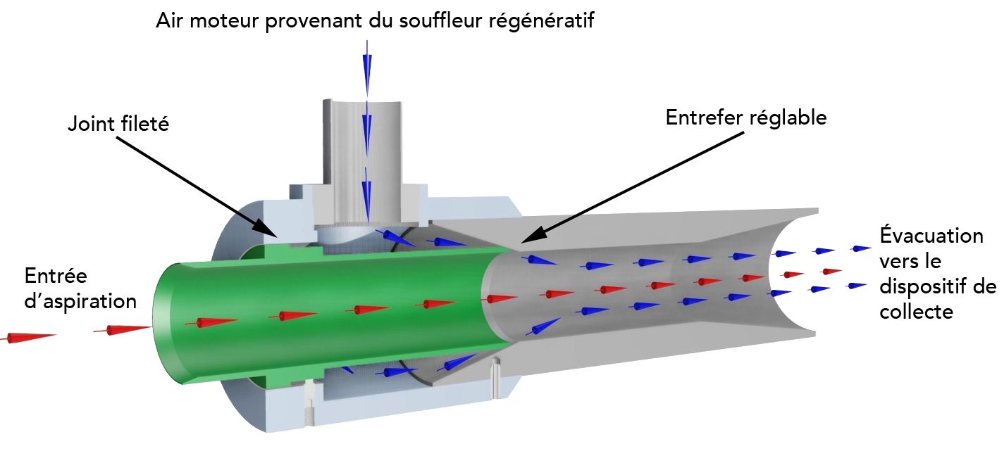 Les systèmes FOX TrimAway utilisent des souffleurs régénératifs haute efficacité pour créer un puissant flux d’air moteur. Cet air est dirigé sur le côté du venturi, où il effectue un virage à grande vitesse à travers un entrefer réglable du venturi. Ce mouvement génère une forte aspiration à l’entrée du venturi. Chaque système est testé et réglé en usine pour garantir des performances optimales, mais l’entrefer ajustable permet d’effectuer des réglages d’aspiration sur site, selon les besoins de la production.