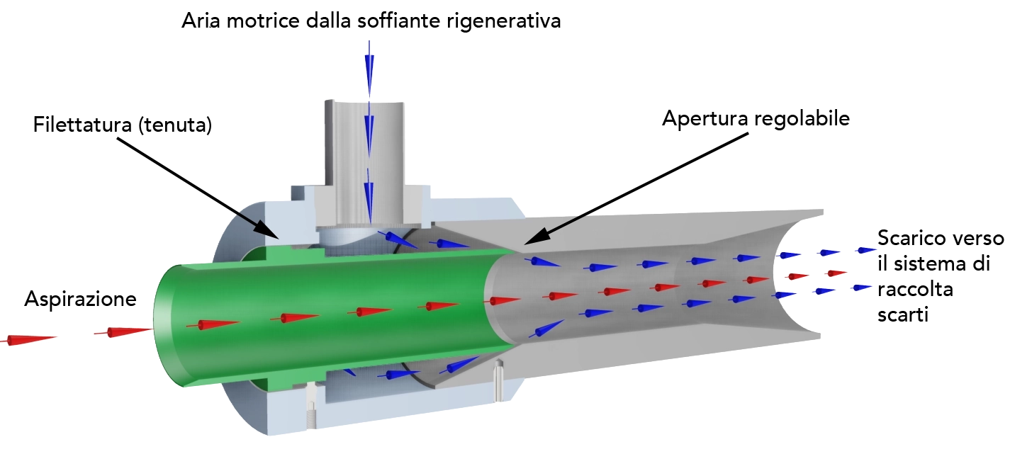 • Venturi in alluminio, regolabile in base ai requisiti del materiale.